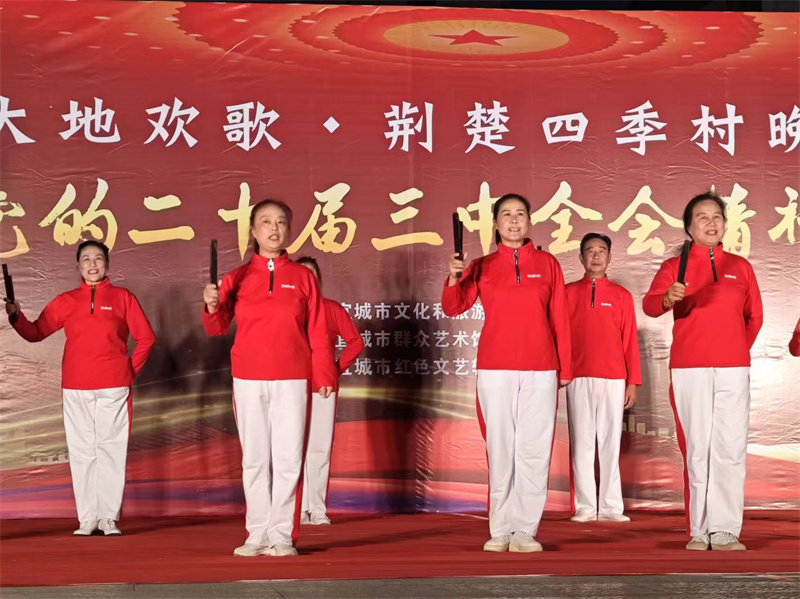 本网讯通讯员李敏瑞报道:为宣传贯彻党的二十届三中全会精神,庆祝新中国成立75周年,增强人民群众的文化自信,10月2日,由宜城市文旅局主办,市群艺馆承办,红色文艺轻骑兵小分队演出的“大地欢歌·荆楚四季村晚”宣传贯彻党的二十届三中全全精神文艺展演在紫盖山广场精彩上演。