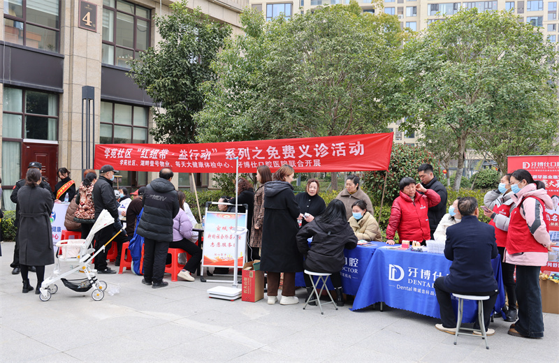 本网讯记者周波报道:3月8日,市委社工部组织学苑社区志愿者和每天大健康中心及牙博士口腔医院医护人员来到东泰湖畔一号小区,免费为全体物业工作人员和小区居民进行免费义诊活动。