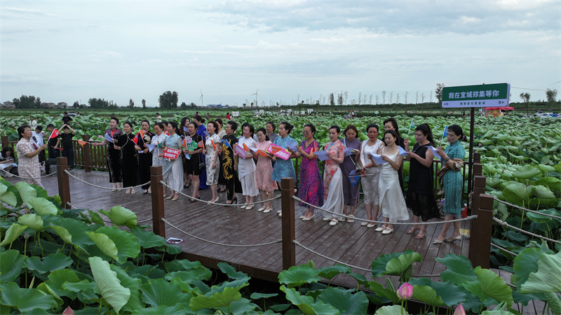 盛夏荷花斗艳开,荷畔旗袍别样美。旗袍秀环节,30多名巾帼志愿者身着古装旗袍,伴随着古典音乐,身姿优雅的在荷塘步道上漫步轻舞,与荷花美景交相映衬,走成一道靓丽的风景线,也向大家传递女性的优雅与自信。