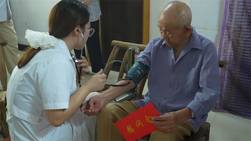 医护人员为老兵进行血压测量、心肺听诊等基础健康检查,针对他们的身体状况给出专业的健康指导和建议,并赠送了常用药品。