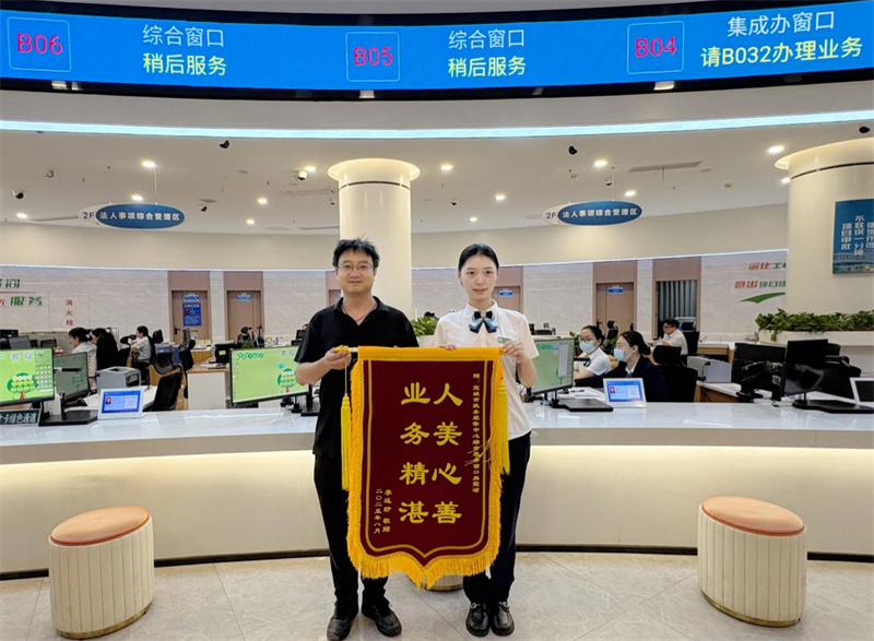 本网讯通讯员覃玲 程泽人报道:8月7日立秋当天,宜城市政务服务中心综合窗口收到一份特殊礼物——办事群众李先生专程送来印有"人美心善 业务精湛"的锦旗。这面锦旗既是对窗口服务的暖心赞誉,更是该中心持续优化营商环境的生动见证。