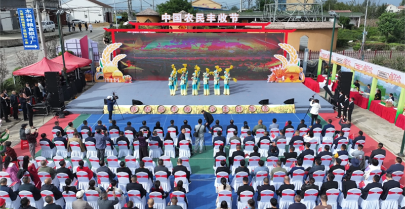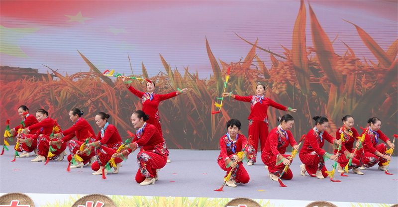 丰收节现场,舞蹈《踏歌起舞庆丰收》、丰收歌曲《在希望的田野上》《楚都美食香飘天下》、连响棍表演《打连响庆丰收》等节目轮番登场,讴歌时代发展,共享丰收喜悦。