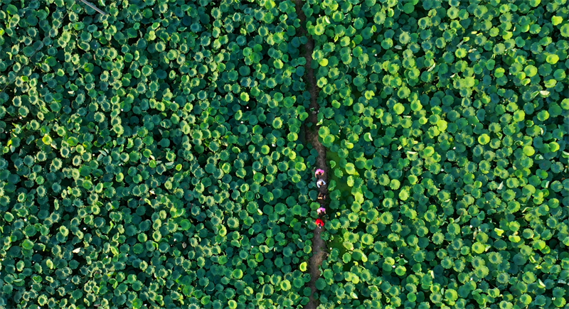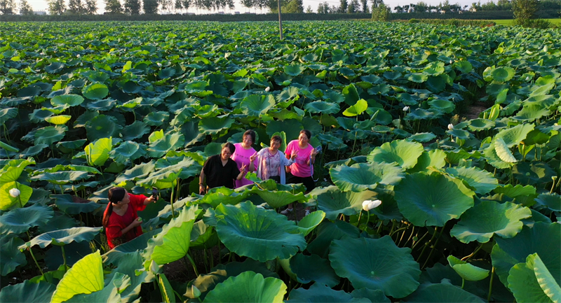 在魏岗村的莲藕种植基地里,片片莲叶如翠绿玉盘,似层层绿浪。微风吹拂,朵朵莲花舞动着优美的身姿,散发出阵阵清香。放眼望去,连片的荷叶与各色的荷花交相映衬,一幅恬静优美的画卷徐徐展开。如梦如幻的荷花仙境,吸引众多游客前来观赏游玩。