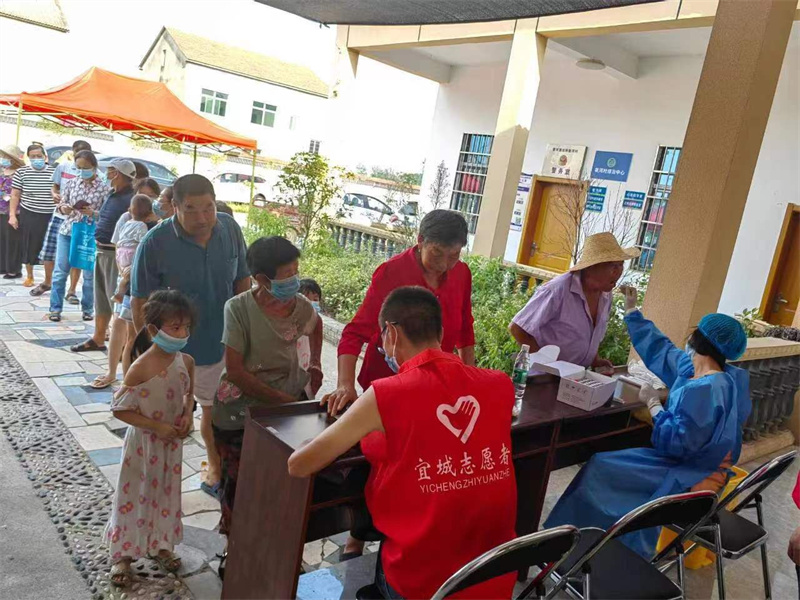有序有力检测。从帮助不熟悉智能手机的老人和未成年人、引导居民采集身份信息,为弱势群体上门服务,指导居民出示健康码、提醒群众佩戴口罩,保持一米线距离,维持现场秩序等等各个环节都能看到干部们忙碌的身影,他们有的是社区干部、有的是老党员、有的是大学生志愿者....他们就是防疫网中的“螺丝钉”,成为了全镇核酸检测工作的主力军。截至8月19日晚8时,在所有居民和工作人员的努力下,全镇已完成第一轮核酸检测1.4万余人,还在连夜有序进行中。