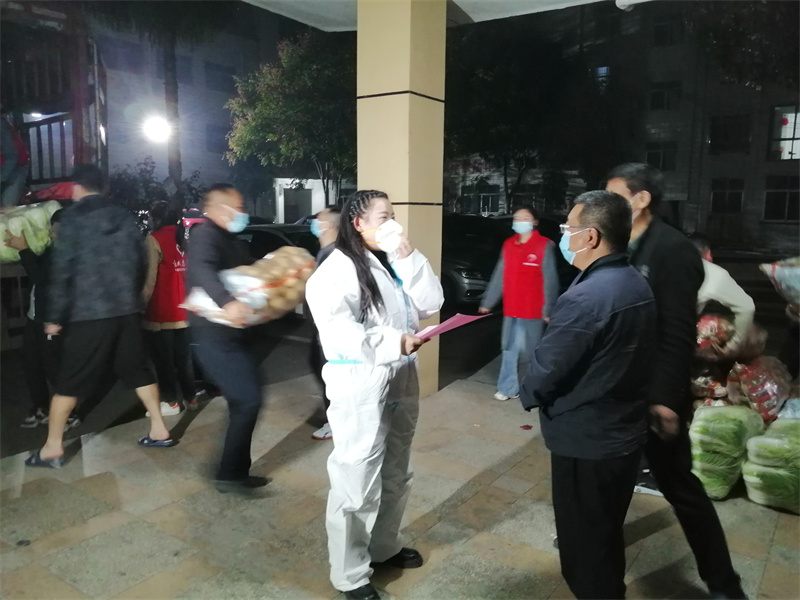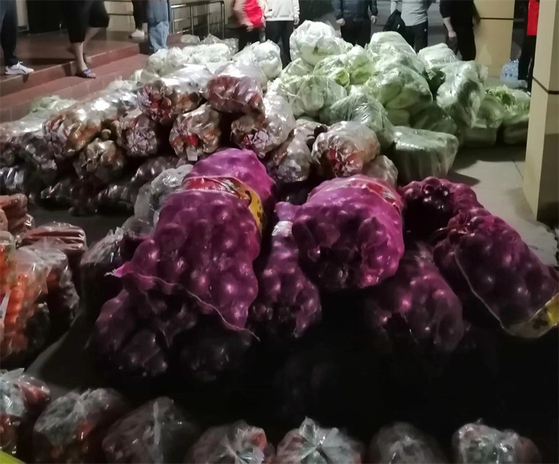 工作人员从货车里卸下一袋又一袋的白菜、花菜、土豆、包菜、洋葱、胡萝卜、白萝卜等蔬菜,共计175麻袋,以及300箱矿泉水、100箱鸡蛋面。