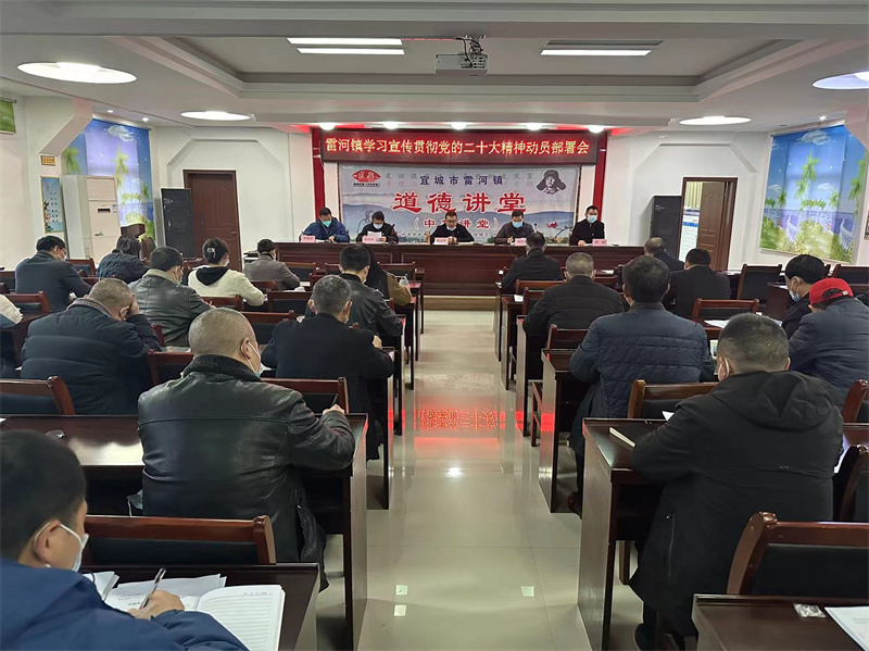 会议传达学习了《中国共产党宜城市第七届委员会第五次全体会议决议》《中共宜城市委关于认真学习宣传贯彻党的二十大精神的决定》等文件精神,宣读了《雷河镇开展学习宣传贯彻党的二十大精神的实施方案》,详细安排了雷河镇学习宣传贯彻党的二十大精神各项工作任务,制定了“组织一场集中收看、开展一轮学习培训、讲好一堂专题党课、组织一次知识测试、开展一次主题党日、开展一批主题宣讲、办好一批民生实事、进行一次作品征集、组织一次关心关爱、开展一轮大调研活动”等“十个一”系列活动。