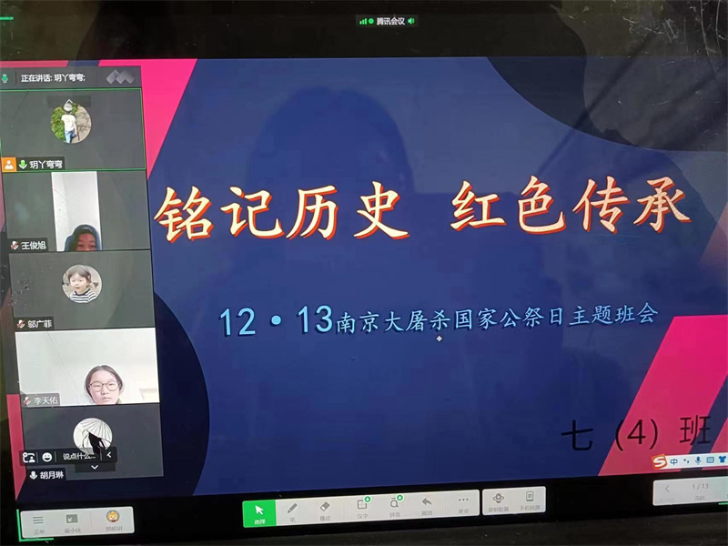 当天上午第三节课,全校12个班如期召开了“勿忘国耻 圆梦中华”主题班会。除了主题班会,还有“朗诵抗战家书”“讲红色故事”“分享心得体会”“看《南京大屠杀》”电影等活动,形式多样。