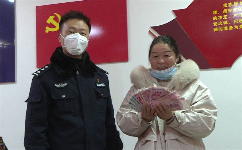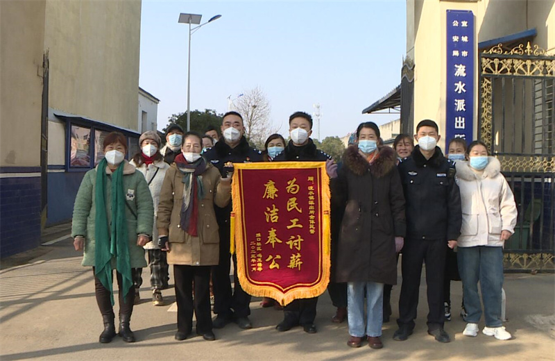 当天,农民工代表冯玉梅向流水镇派出所送来" 为民工讨薪 廉洁奉公"的锦旗。"今天拿到了拖欠两个月的工资,有六千多块钱,非常高兴。感谢派出所民警,等会儿把钱拿了之后到街上买点年货。 "
