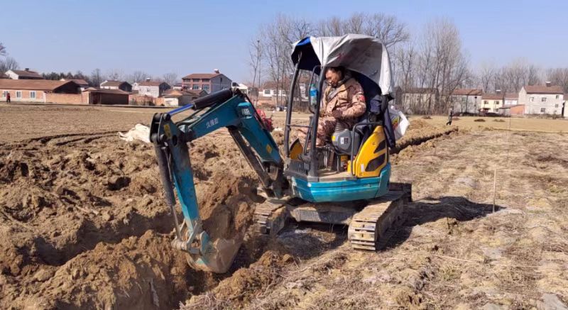 与李云峰家人工采挖方式不同,村民肖雪梅家则用上了机器采挖,在她家的山药地里,一台采挖机轰隆隆作响,不一会就挖出一条深沟,3名工人在挖好深沟里采挖山药,效率提高了不少。