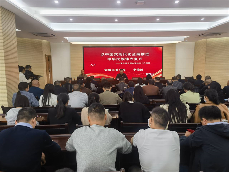 市委宣讲团成员李俊波以《以中国式现代化全面推进中华民族伟大复兴——深入学习党的二十大精神》为题作了主题报告。从战略定位、大会主题、实践基础、理论指导、基本路径、根本保证、团结要求等七个方面,对党的二十大精神进行了生动、全面、系统的阐述和解读。