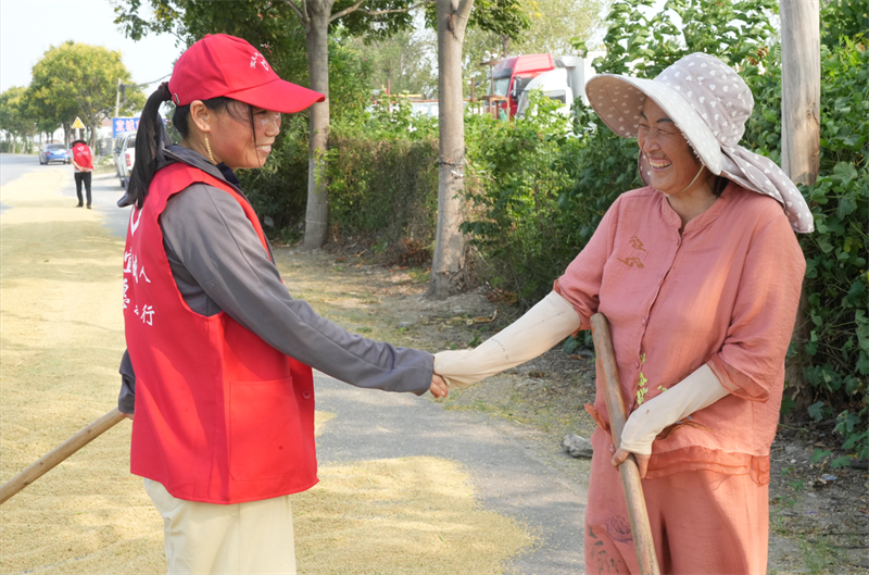 Ìúºþ´å´å¸É²¿ÕÅ¿¡Ëµ£º¡°ÏÖÔÚË®µ¾½øÈëÊÕ¸îÆÚ£¬ÎÒÃÇÌúºþ´å¸É²¿½èÖúÕâÇçºÃµÄÌìÆø£¬°ïÀÏÈËÃÇÊո×Ó£¬¼õÇáËûÃǵĸºµ£¡£¡±