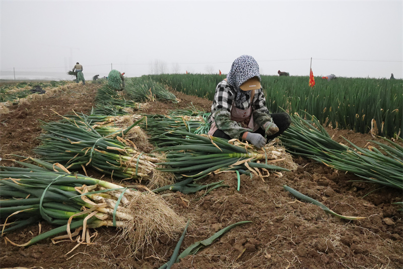 宜城市楚丰现代农业种植有限公司作为小河镇2022年引进的农业企业,专注于农作物及蔬菜的种植。在联盟村连片的葱田里,几十名工人正熟练地进行拔葱、捆扎、装车作业。自3月9日采收以来,每天有20多亩大葱通过物流发往各地,预计一周内可完成全部采收。