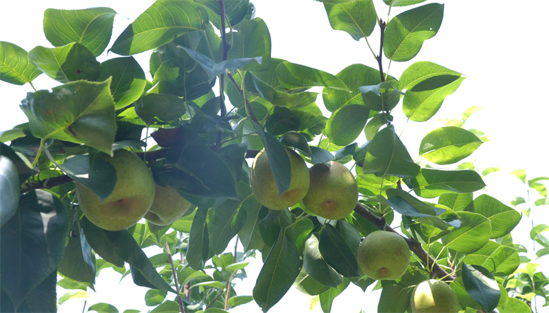 据悉,该梨园主要种植脆冠、圆黄两个优质梨品种,目前呈现“一熟一待”的丰收景象。其中,脆冠梨已进入最佳采摘期,饱满的果实挂满枝头,表皮翠绿光滑,散发着诱人的清香。园主王传友随手摘下一颗脆冠梨,轻轻一咬汁水便顺势流淌,他说:“这梨子水分足、口感脆甜,都是我们精心照料的成果。”
