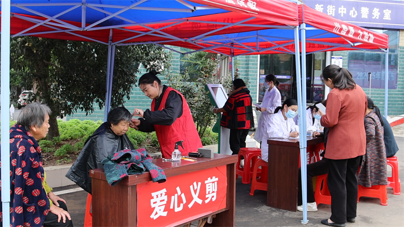 在公益集市现场,医务人员为居民进行免费义诊,让辖区居民在家门口就能享受到专业的医疗服务。现场还设有免费理发、反电诈知识宣传、政策咨询、免费拍照等服务项目,受到一致好评。