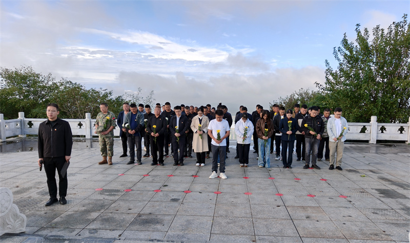 在《献花曲》的悠扬旋律中,民兵代表迈着整齐的步伐向烈士敬献花篮。镇长徐华勇缓步上前,仔细整理花篮缎带,并带领全体人员依次向纪念碑献花,随后缓步绕行纪念碑一周,瞻仰烈士事迹浮雕,重温革命历史。